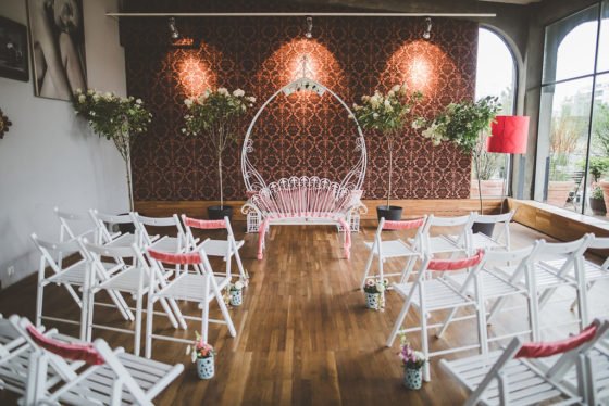 Als weiteres goldenes Detail fällt der Dekoschriftzug ‘Love’ in gold ins Auge. Die langen Stabkerzen im Salbei-Farbton greifen die Farbe der Eukalyptuszweige auf. In den goldenen Kerzenhaltern wirken die Kerzen auf dem Tisch elegant und stilvoll. Kleine goldene Konfetti auf den Tischen verteilt lockern die Atmosphäre auf.