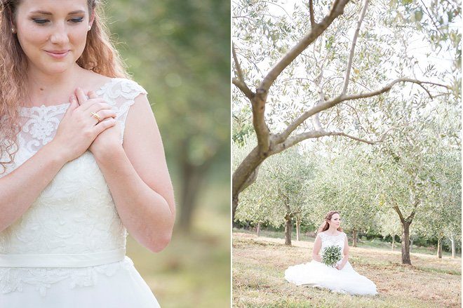 Die ungezähmte und raue der Natur trifft auf eine natürliche Braut, deren Haarpracht nur mit ein paar Olivenzweigen geschmückt wurde. Visagistin Andrea kümmerte sich um Haare und das Make-up: es ist natürlich, aber wunderschön. Das Brautkleid spielt mit feinen Stickereien am Oberteil, die dem schlichten Schnitt eine gute Portion Eleganz mitgeben.