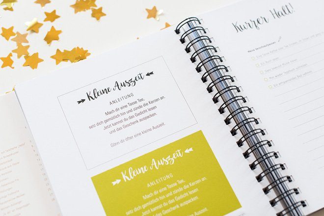 Dazu gesellen sich Seiten, die man wie ein Tagebuch, beschriften und mit schönen Momenten füllen kann. So wechseln sich Seiten mit konkreten Anleitungen, nützlichen Tipps, Kopier-Vorlagen, Downloads und sogar ein paar Checklisten ab. Zusammen ergeben sie ein Werk mit dem man wirklich gut arbeiten kann und jede Menge Spaß hat.
