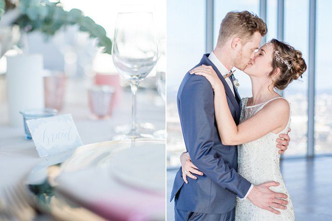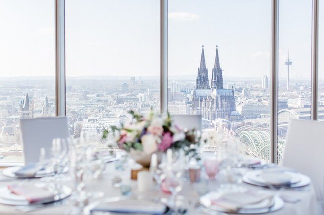 Tolle Dienstleister haben zugesagt und so ist aus der Idee ein wahrer Augenschmaus geworden: Modern, elegant und mit einem Touch Glamour. Die beiden Trendfarben 2016 von Pantone “Rose Quartz” und “Serenity” passen perfekt dazu und Nicole von Nicnillas Ink hat Farben und Thema zu einer leichten, luftigen Papeterie-Serie zusammengeführt. Die wunderschön schlichte und klare Tischdekoration wird von einem Bukett in sanften Farben gekrönt, lenkt jedoch nicht ab vom eigentlichen Mittelpunkt, der Aussicht von Wolke 7. Und die ist so großartig und weit, dass man meinen könnte, man sei tatsächlich auf einer Wolke hoch oben gelandet. Die Wolke ist in diesem Fall KölnSKY und das ist mit seiner Lage im 28. Stock den Himmel wirklich sehr nah. Wer dem Himmel auch bei der standesamtlichen oder der freien Trauung schon nah sein möchte, hat hier sogar die Möglichkeit dazu.