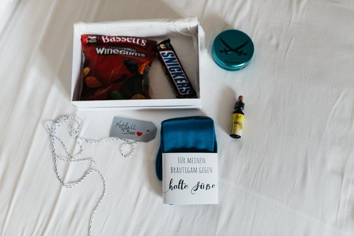 Mit dem Hotel Rungholt hatten die beiden den perfekten Ort für Ihre besondere Zeit auf Sylt gefunden. Mitten in Kampen, mit Blick auf das Rote Kliff, ein Haus mit edlem, dezentem Ambiente. Wie gemacht für ein fotogenes Getting Ready! Bevor es aber los ging, überreichte Silke Jens noch eine Notfallbox mit allem, was der aufgeregte Bräutigam so braucht – Weingummi, warme Socken, Rescue-Tropfen und mehr. Alles verpackt mit einem lieben Gruß in einer hübschen Box. Aber so aufgeregt war der Bräutigam scheinbar nicht, denn er hatte genug Ruhe, sein Hemd selbst zu bügeln!