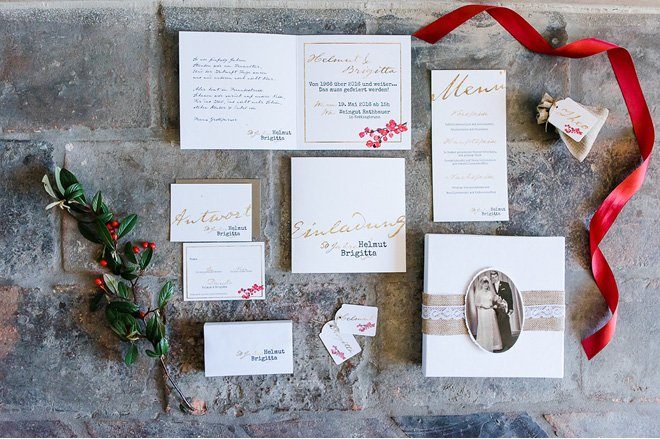 Als zentrale Elemente für die Papeterie wurden auch die roten Beeren aufgenommen. Wie das Originalmenü der Hochzeit (im Jahr 1966 vom Bräutigam selbst auf der Schreibmaschine getippt), ziert auch die Papeterie eine Schrift im Schreibmaschinen-Look. Das Hochzeitsfoto veredelt die Einladung in der Jute-Box.