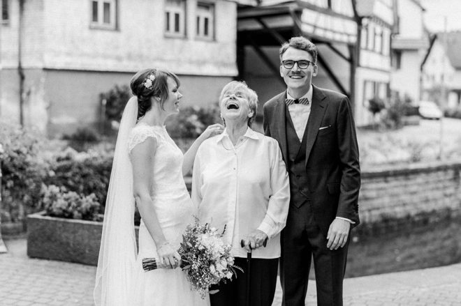 Wahre Liebe ist es übrigens auch, wenn der Bräutigam in der Kirche für die Braut ‘Ring on Fire’ singt. Ein Gänsehaut-Moment, nicht nur für die Braut. Und das Outfit der beiden ist großartig: Ein dezentes, stilvolles Spitzenkleid mit Schleier trifft auf einen eleganten Maßanzug mit Weste und Holzfliege. Dazu ein schwarzer VW Käfer als Hochzeitsauto – das freut das Fotografenherz! Wenn man dann noch Freunde hat, die als Peruanische Straßenmusiker das Fest bereichern, dann ist wohl richtig Spaß angesagt!