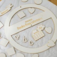 Ein Kranz für Lehrer /Innen und Erzieher/Innen, der liebevoll von den Kindern gestaltet wird. Das Set besteht aus 30 verschiedenen Holzformen wie Herzen, Kreisen und Vierecken, die beschriftet oder bemalt werden können. Zusätzlich sind noch verschiedene, kleine Dekoelemente wie das a,b,c, das Haus, der Banner und Zahlen dabei. Die kleinen Holzformen und die Dekoelemente werden einfach mit flüssigem Klebstoff auf den Kranz geklebt.