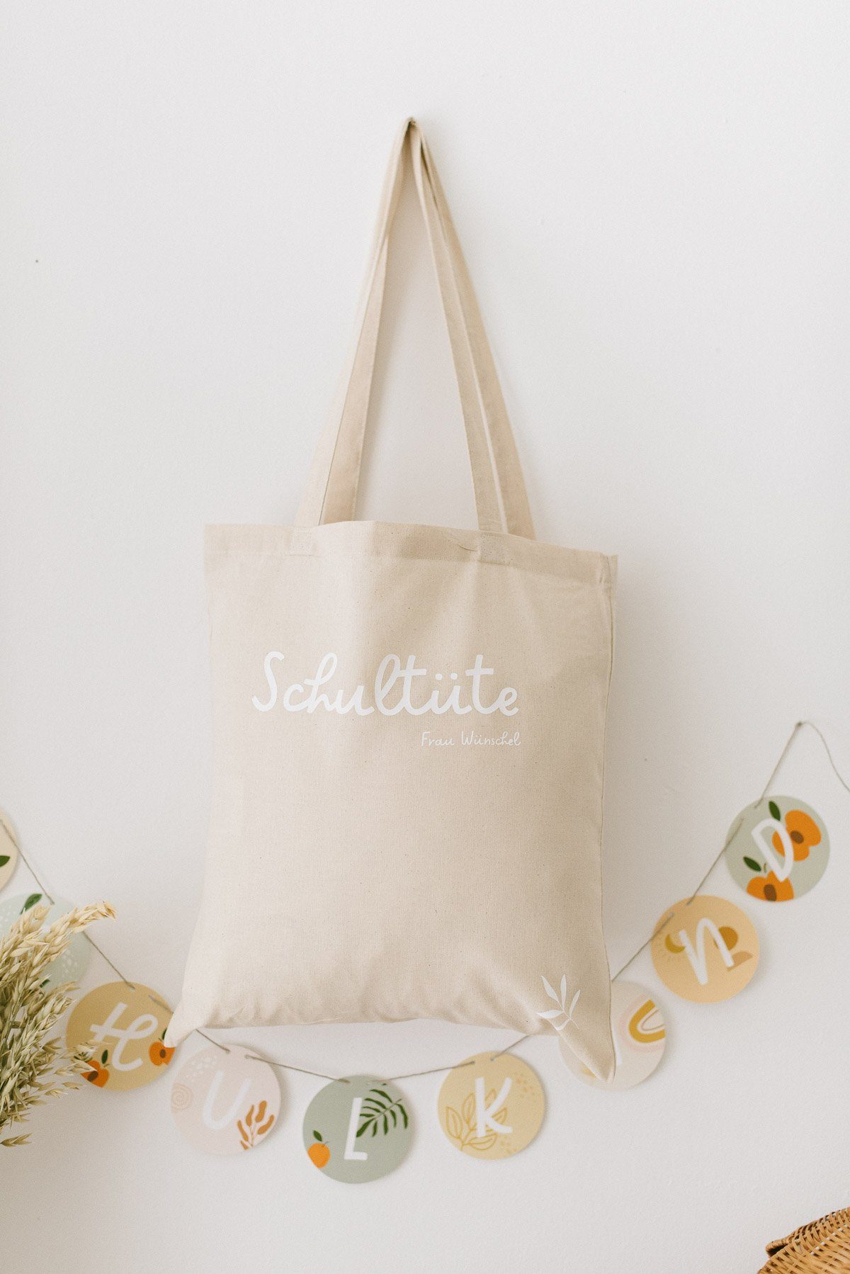 Ein schönes, persönliches und praktisches Geschenk für Lehrerinnen und Lehrer: Die robuste Baumwolltasche wird mit dem Aufdruck ‘Schultüte’ und dem Namen des/der Lehrer/In personalisiert.