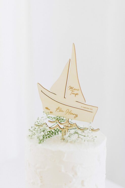 Der Cake Topper und das Wellenmotiv werden aus einer 3mm Pappelholzplatte gelasert.