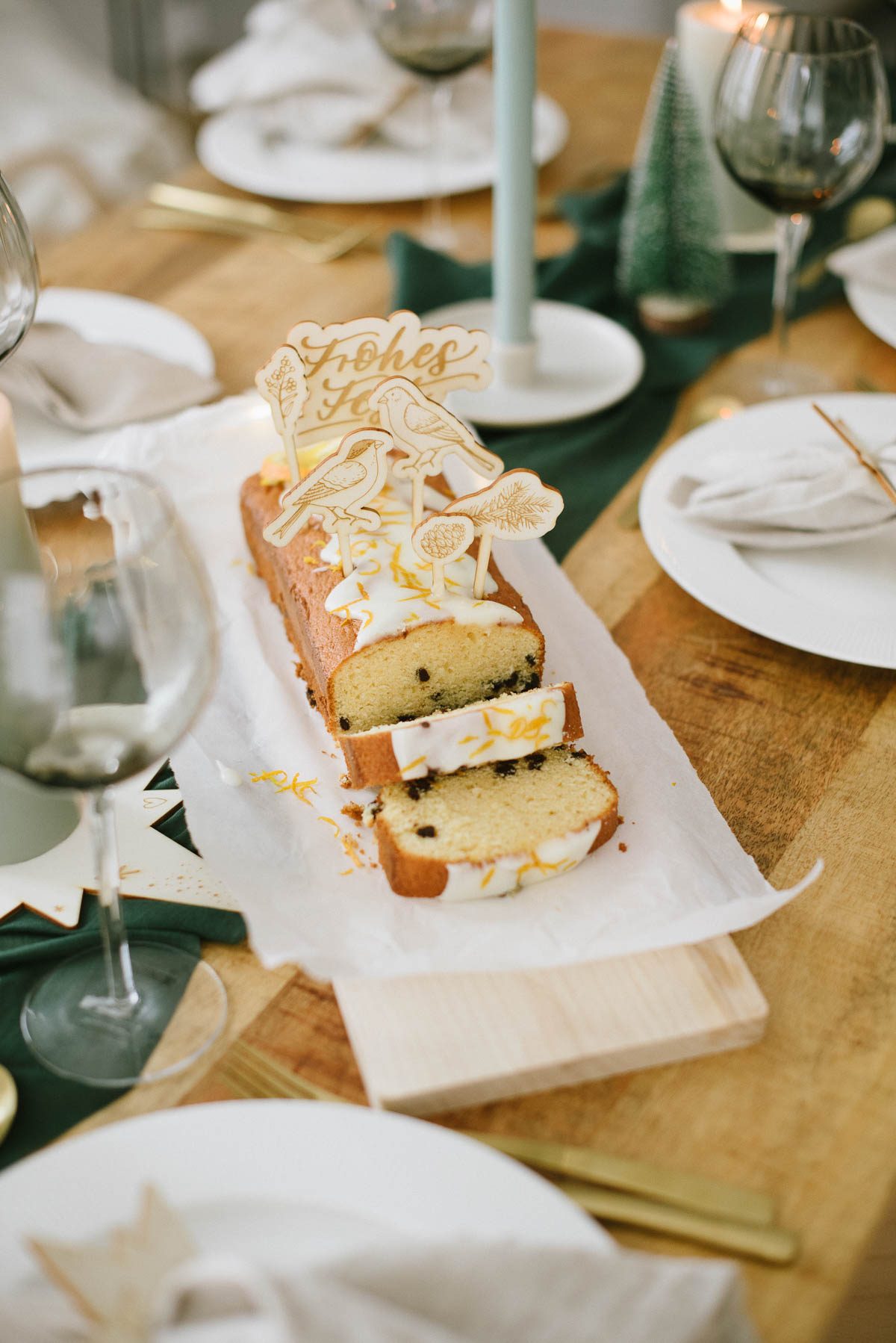 Sechsteiliger Caketopper mit zwei Vögelchen, einem Mistelzweig, einem Tannenzweig, einem Tannenzapfen und dem Schriftzug ‘Frohes Fest’.