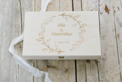 Die Erinnerungsbox aus Fichte mit einem Klappdeckel ziert die Namen des Brautpaares und das Datum des Großen Tages. Dazu passend eine moderne Ranke.