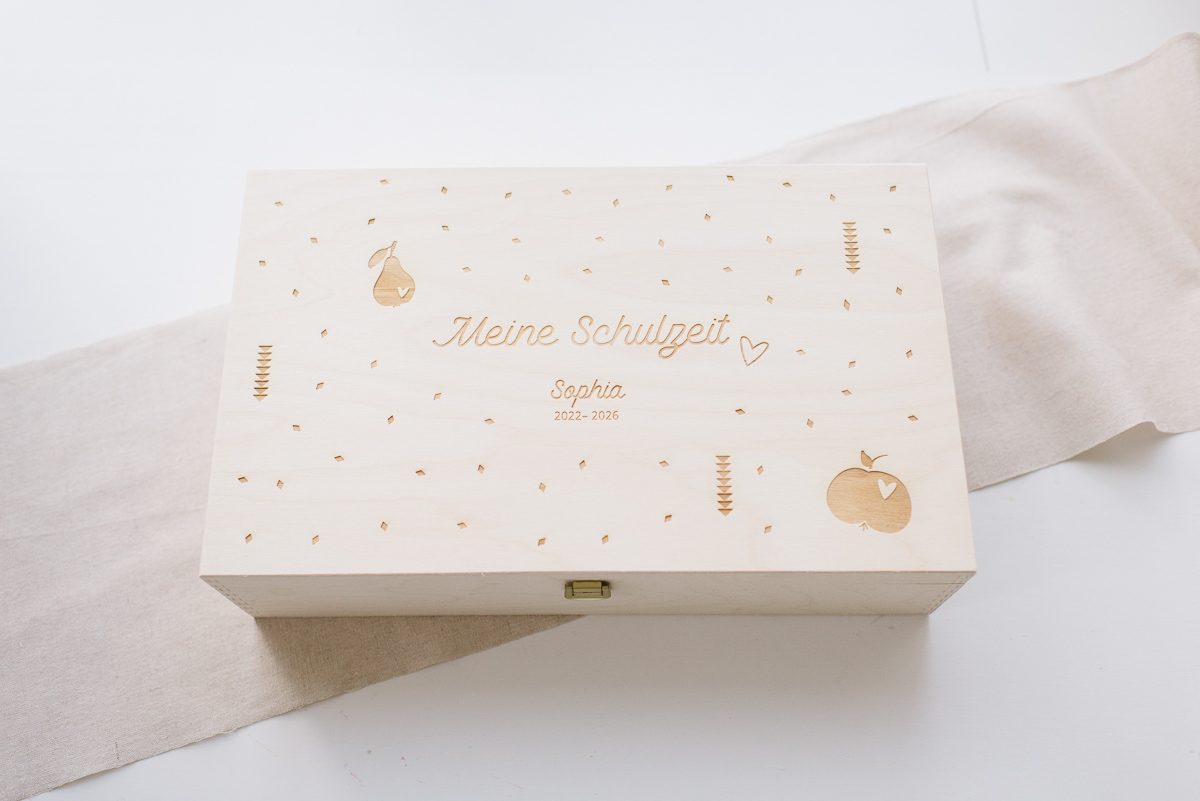 In dieser großen Holzbox finden sie ihren Platz! Wir gravieren sie mit dem Namen des Schulkindes und dem Zeitraum Eurer Wahl.